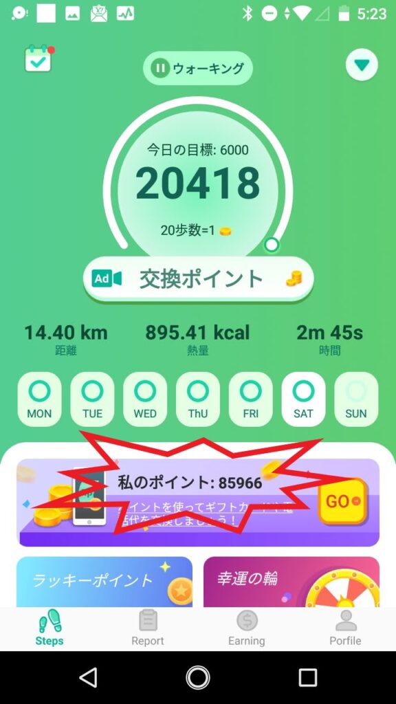 この日は2万歩歩いたので、歩数で2000ポイントゲットできるはず!歩数ポイント獲得の流れは、